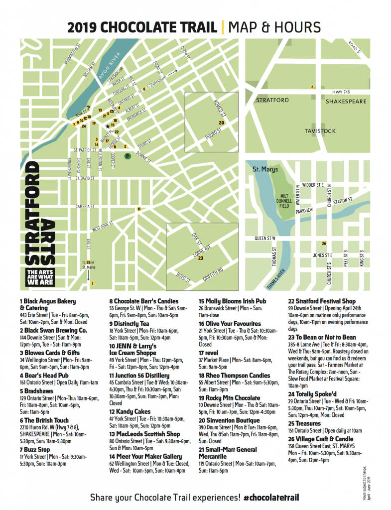 Don’t forget to follow @visitstratfordon on Instagram for daily updates and make sure that if you post your Chocolate Trail pics, tag @visitstratfordon and hashtag #chocolatetrail so they can share your experience with others!