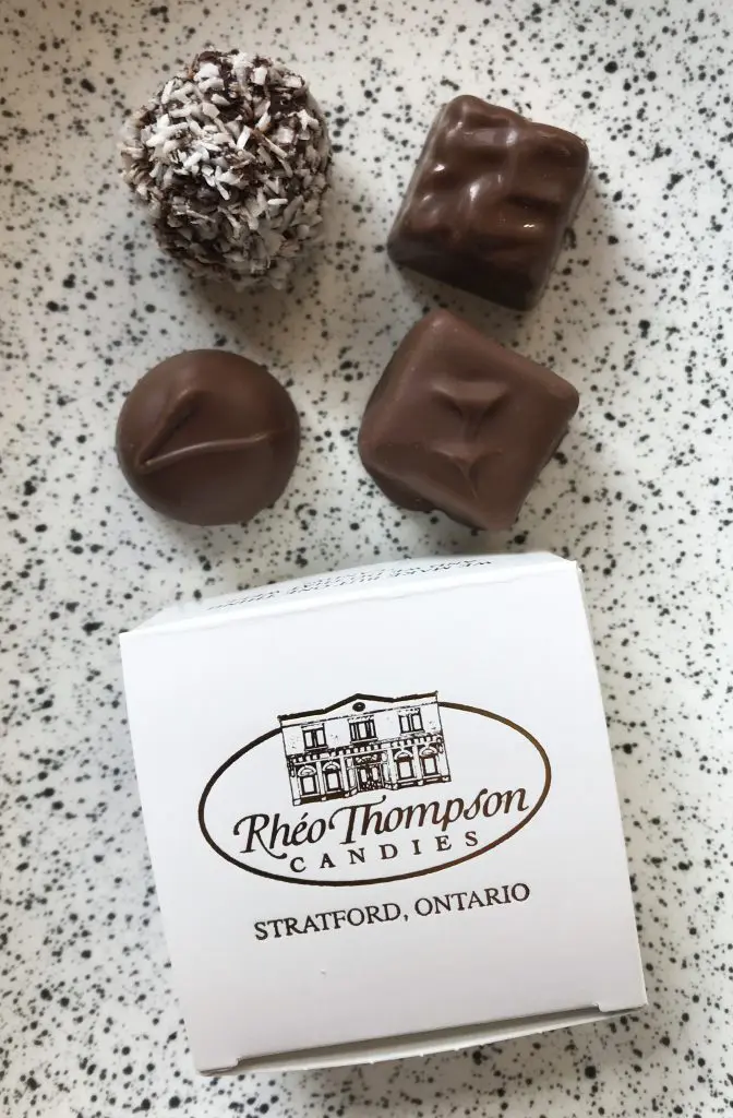 Next stop on the Stratford Chocolate Trail was our friends and neighbours Rheo Thompson Candies – now celebrating 50 years of hand-making candies in Stratford. ALSO a husband and wife team, Kritstene and Marc Steed run a stunning European style shop that literally MUST be on your list of places to visit in Stratford… If you miss this stop, you haven’t experienced the city correctly! Since their shop is on Albert Street (the street directly behind Bradshaws) you can imagine it was a daily stop for me when I was pregnant with both kids. The order always included snowballs and maple creams… But on the chocolate trail, we got to choose 4 chocolates – a signature milk chocolate mint smoothie, a hazelnut praline (apparently RTC’s owner Kristene’s favourite chocolate) a vanilla cream and a snowball for old times sake. Gigi kindly and generously shared these with her brother Ezra.