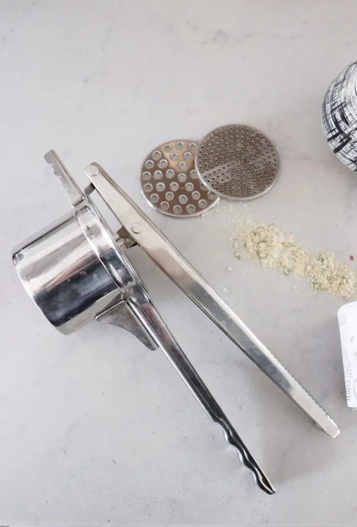 The RICER tool forces cooked potato through small holes, resulting in rice-like pieces of potato – hence the name! And NO lumps! See our instagram stories to see this tool in action!