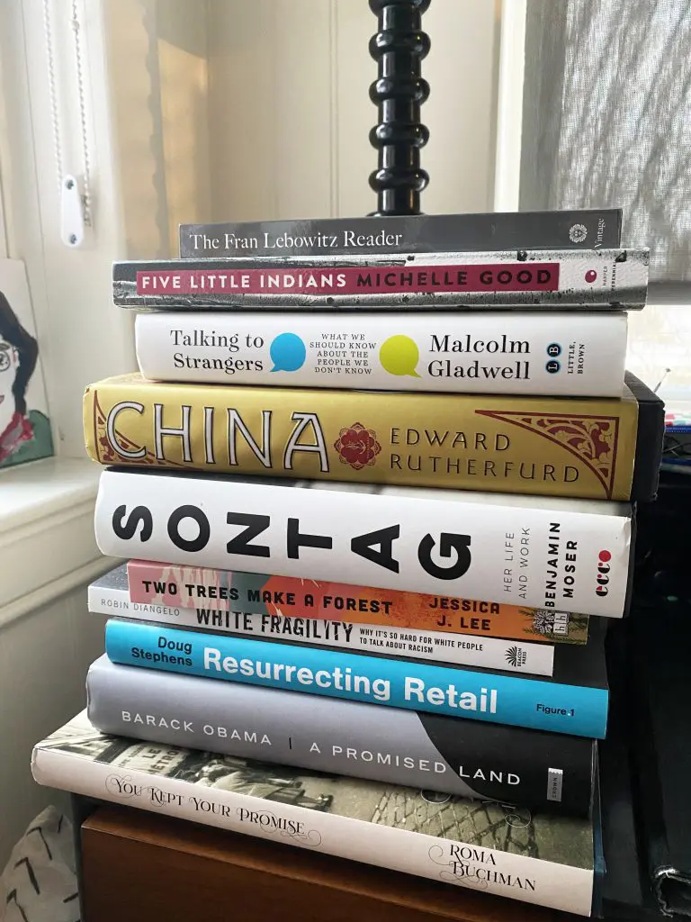 Understanding this cycle helps me be kinder to myself. It allows for me to give myself  time and space to read, cook, relax with my family, listen to music, go for afternoon walks and basically come back down to earth. This is an image of my book stack – some already read, others waiting to be embraced.