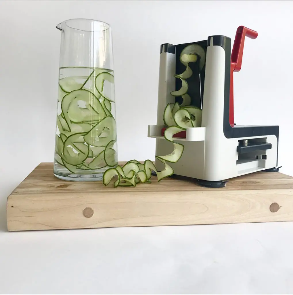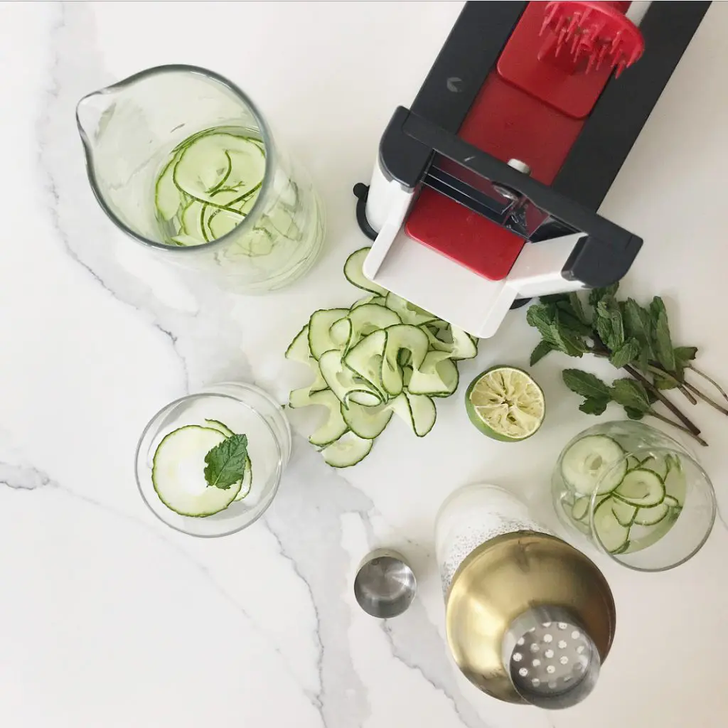 Spring is here and we are feeling inspired once again to get our spiralizing on! Super simple SPA WATER inspiration – Spiralize cucumbers and submerse in a jug of water, place in the fridge and let the cucumber infuse the water – 15mins is often enough time. Then you have beautiful spa water on hand and it makes a gorgeous statement on any bar, dinner table, etc. We use our Westmark Spiromat Fruit & Vegetable Slicer. Available online or in our Kitchen Department for $99.00. It features 3 interchangeable, heavy-duty, stainless steel slicing attachments that cut fruit and vegetables into spirals, spaghetti, or rings. Great for gluten-free and vegan recipes!