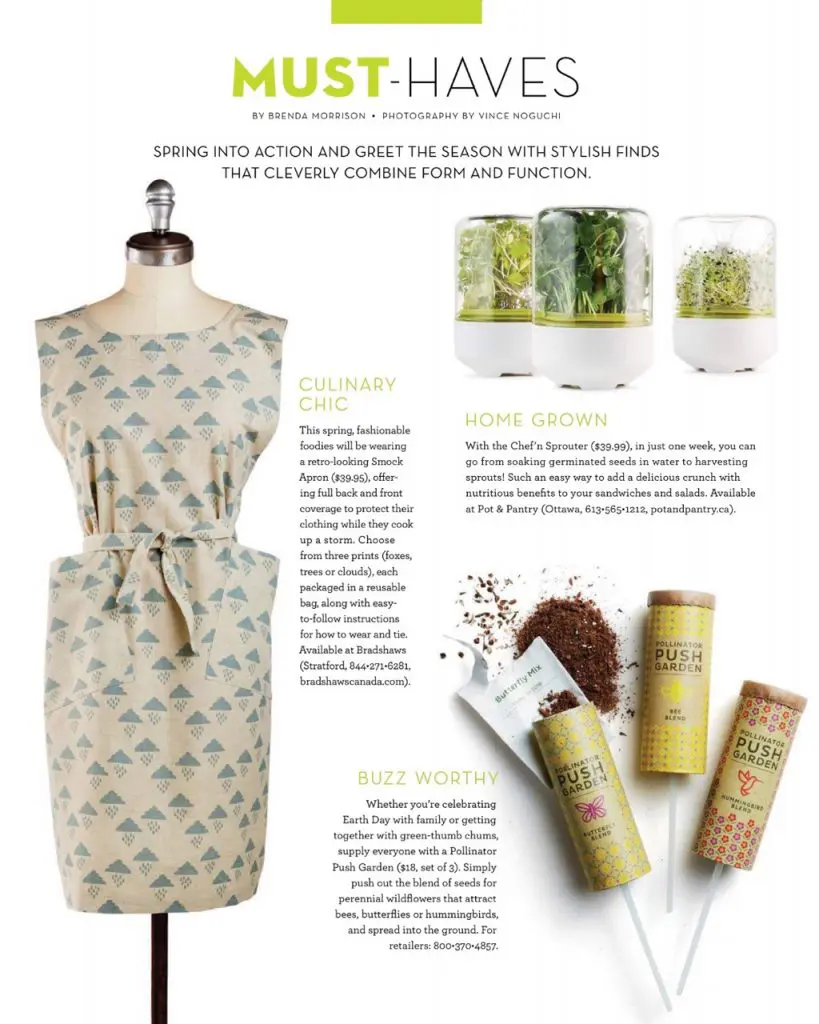 Bradshaws is mentioned in the latest issue of the LCBOs Food & Drink Magazine! Looking to add some style to your function in the kitchen this Spring, our beautifully designed Smock Aprons are a ‘Must-Have’.