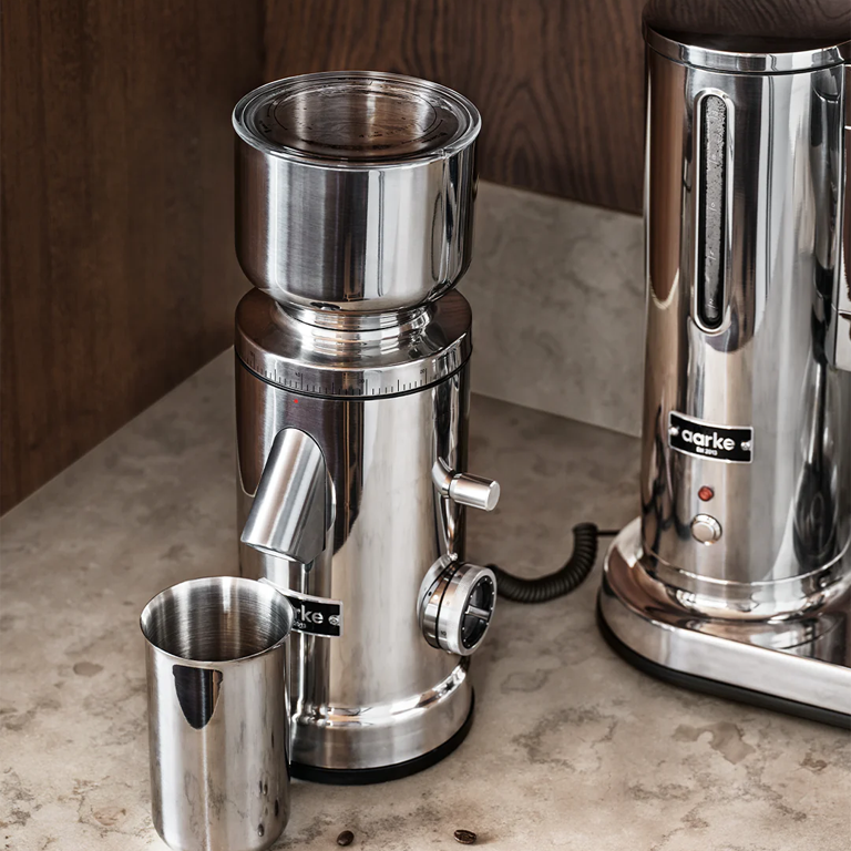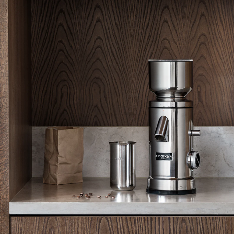 The Aarke Coffee Grinder, made from stainless steel, delivers coffee grounds tailored to your preferred taste. With an adjustable grind size dial, it supports everything from moka pot to cold brew. Its 64 mm flat burrs and consistent motor speed guarantee evenly sized grounds for optimal flavour extraction.