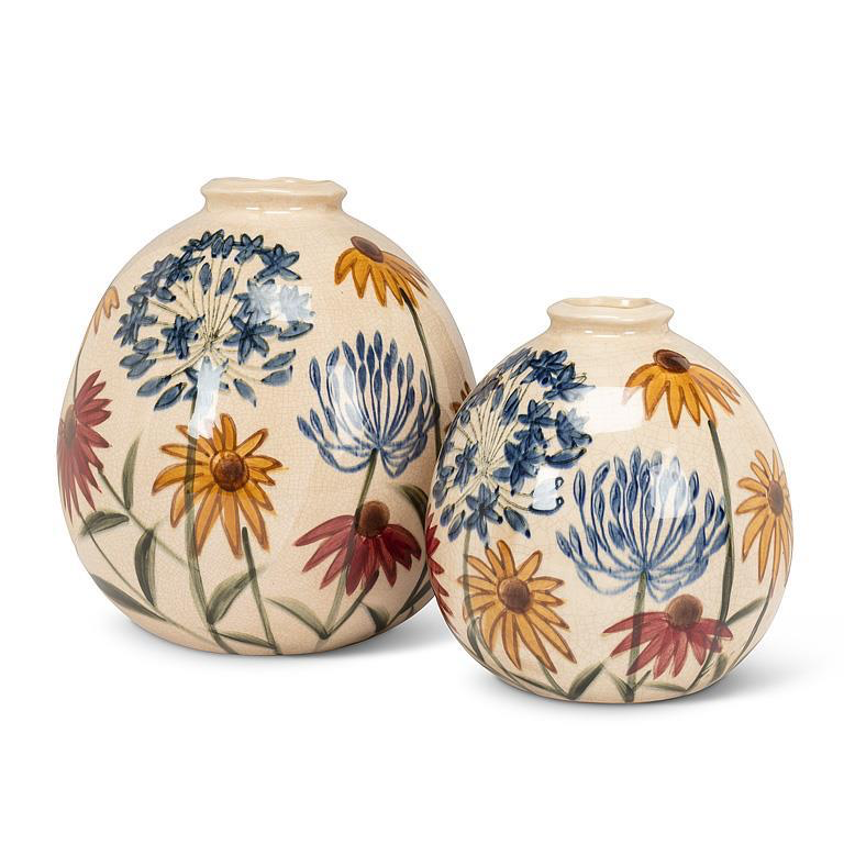 Round and ready, this 9″ ball vase is decorated with sculpted allium blooms. It’s short in stature but big on personality.