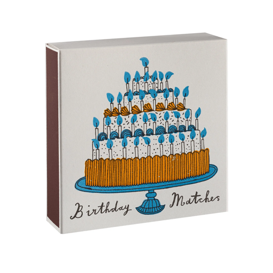 The signature square matchbox featuring a four-tier birthday cake with blue candles placed around each tier and the words ‘Birthday Matches.’ Designed by Charlotte Farmer.