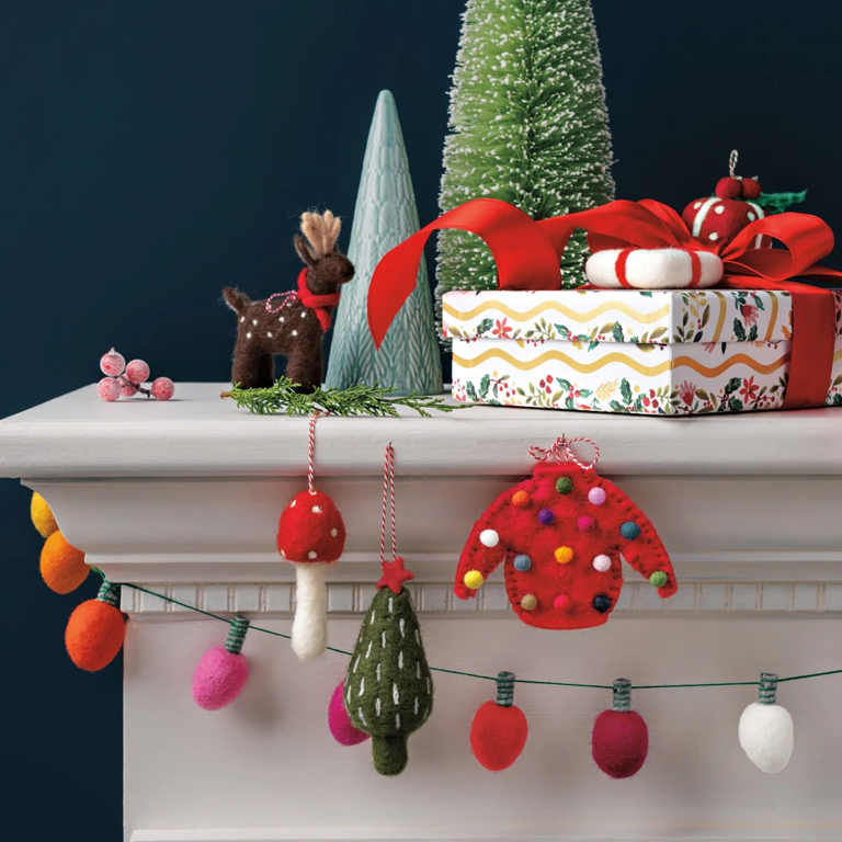 Trim the tree or deck the halls with this handcrafted Spirits Bright felt garland. Strands of Christmas bulbs wrap the home with color, charm, and holiday cheer.
