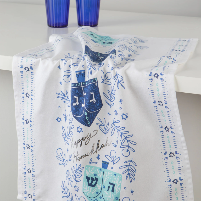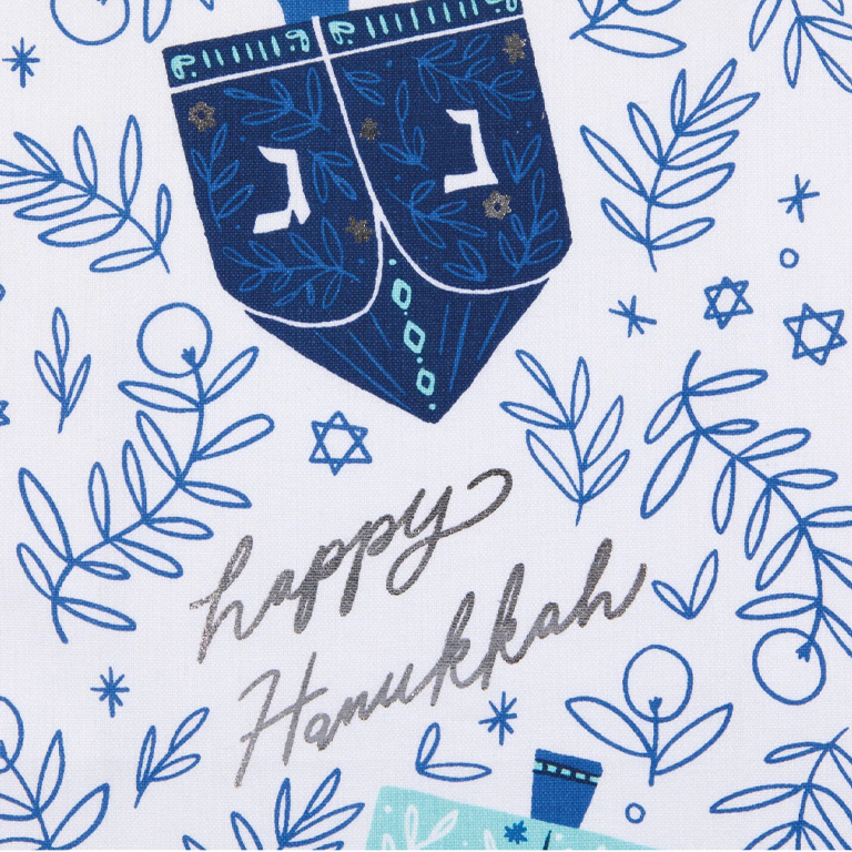 Catch some positive holiday vibes and mark this celebratory moment with the Dreidels cotton towel. Featuring unique textile embellishments this towel is anything but ordinary. In shades of blue and glints of metallic foil, whirling with dreidels that take center stage adding a playful touch to the eight days of Hannukah.