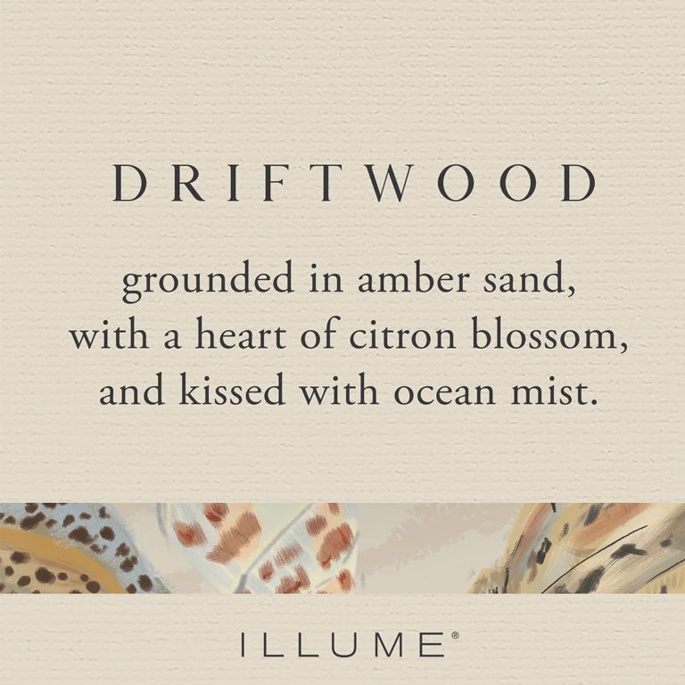 Illume’s Driftwood is grounded in amber sand with a heart of citron blossom kissed with ocean mist. With a modern shape and grounding white ceramic collar, this reed diffuser is refillable with our 6oz alcohol-free diffuser refill which includes just enough oil for two long-lasting uses.