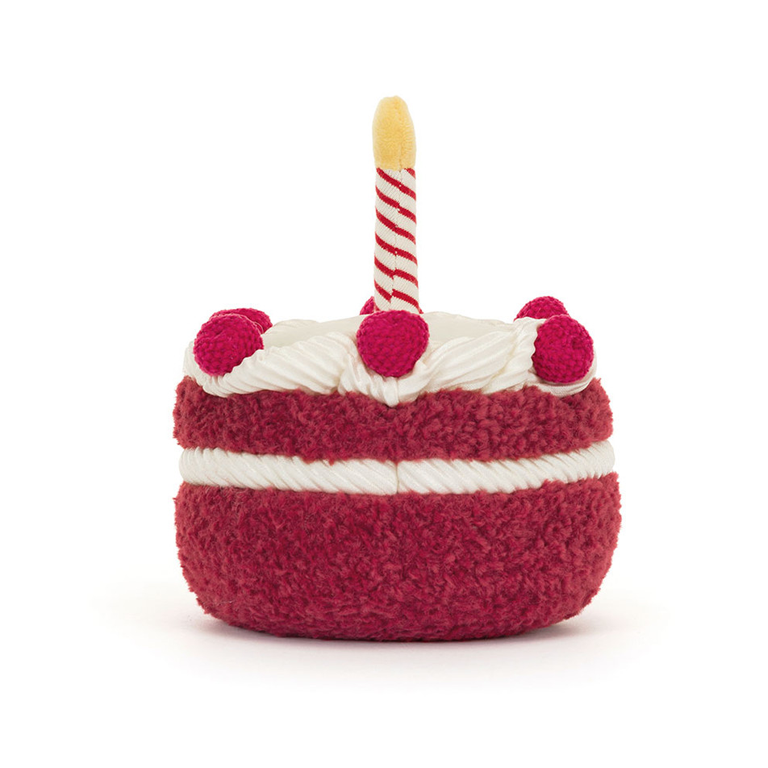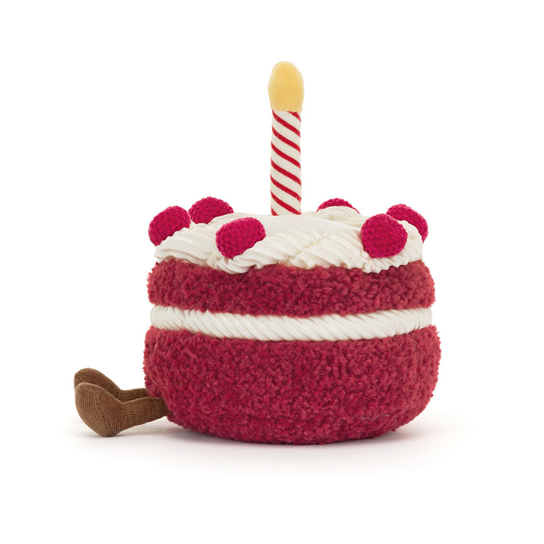 Amuseables Cheri Cake has been baked with love. This red velvet sweetie has a base of bold red tousled fur, with cream textured icing. Finished with textured berries and topped with a striped, lit candle, this smiling sponge is the perfect sweet treat.