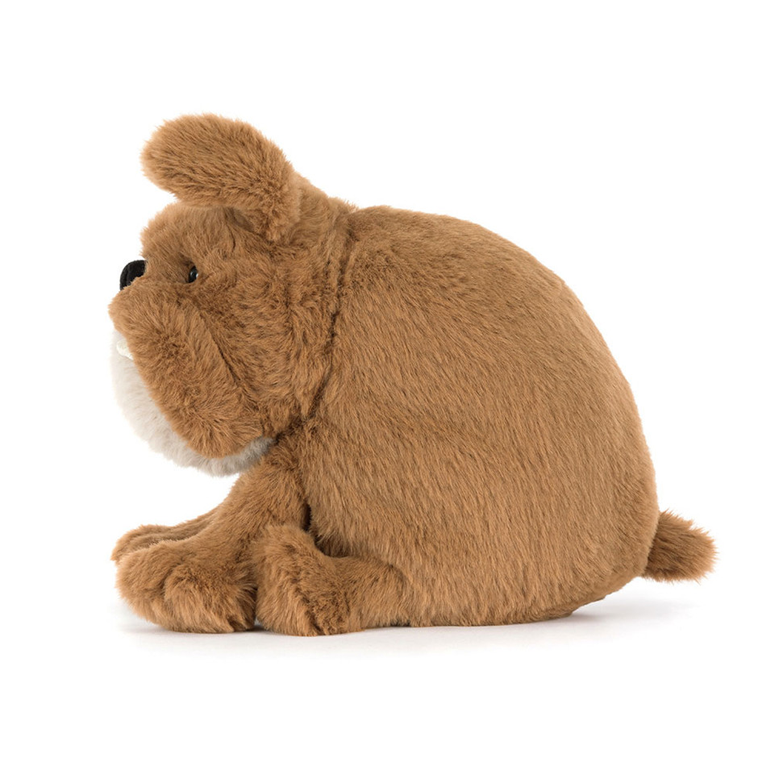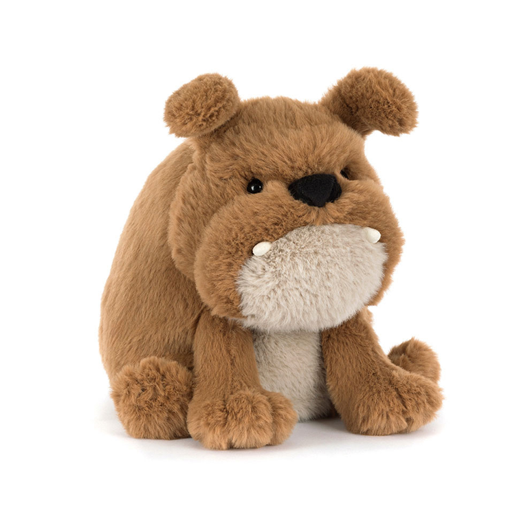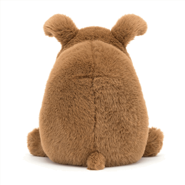 Derreck Dog may be frowning, but he’s really a super friendly fellow! Soft and squat in brown fur, Derreck has an oatmeal tummy perfect for belly rubs! With a grumpy face complete with stitched frown and cream suedette teeth, this darling dog is the perfect social companion to bring a little joy to every journey!