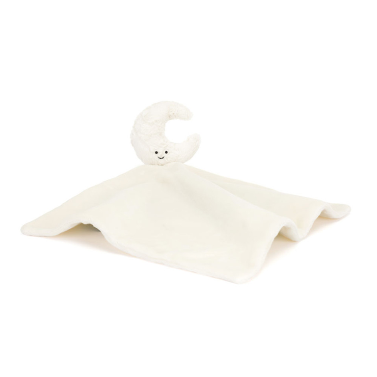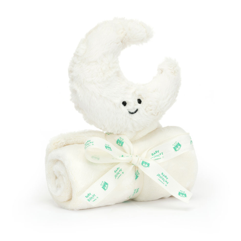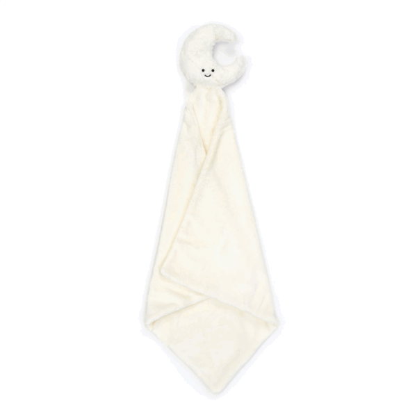 The Amuseables Moon Soother is beautifully textured in cream fur with embroidered eyes and cheerful smile. The crescent moon holds an irresistibly soft soother, made with recycled fibres. Rolled up and presented in a Baby Jellycat grosgrain ribbon, it makes a gorgeous gift for newborns, sure to bring smiles and cuddles.