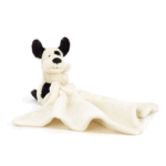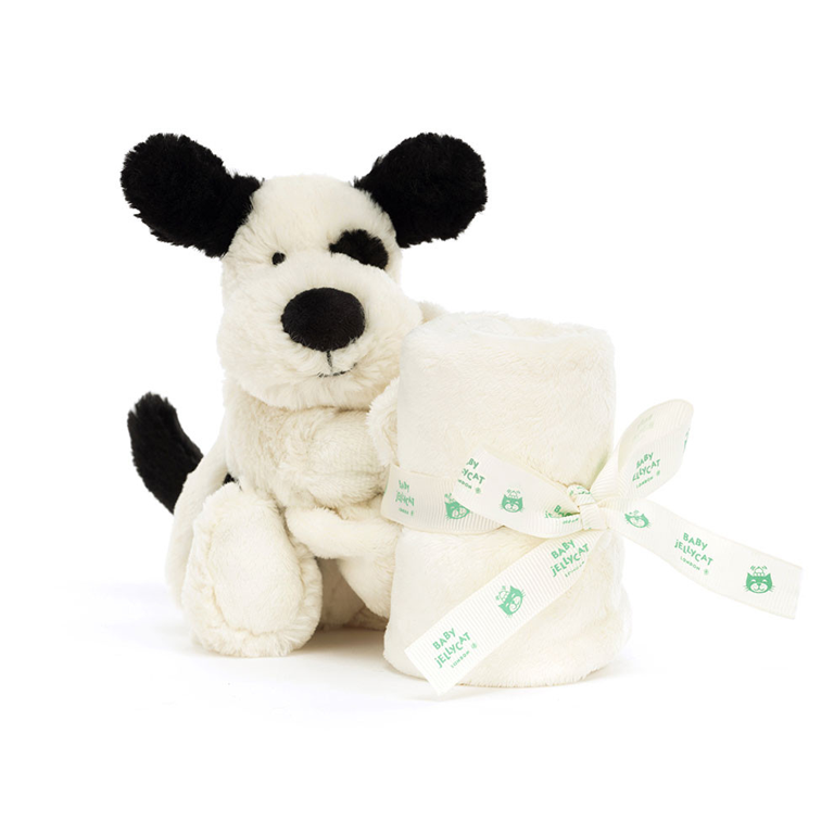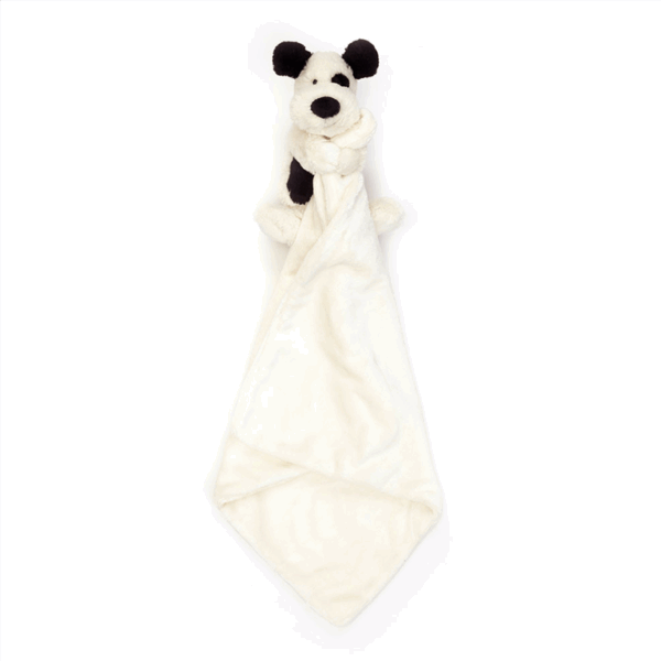Cuddle up with Bashful Black & Cream Puppy Soother; their most loved monochrome pup with adorably perky ears and cheeky smile holding onto an un-stuffed and irresistibly soft, square shaped soother, all made from recycled fibres. Neatly rolled and presented with a Baby Jellycat grosgrain ribbon; destined to be a lifelong companion.
