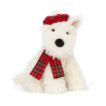 Winter Warmer Munro Scottie Dog is snuggled up against the cold! Wearing a red tartan tam o’ shanter and matching crossover scarf, this wee dog is plenty cosy! With gorgeously shaggy porridge fur, a black nose and pink inner ear, Munro is the pup for toasty cuddles.