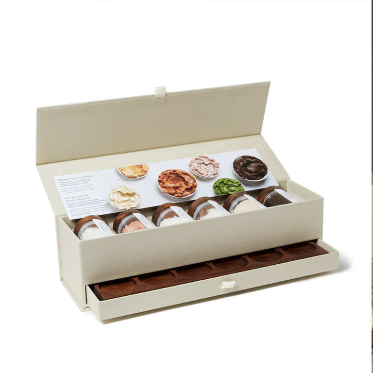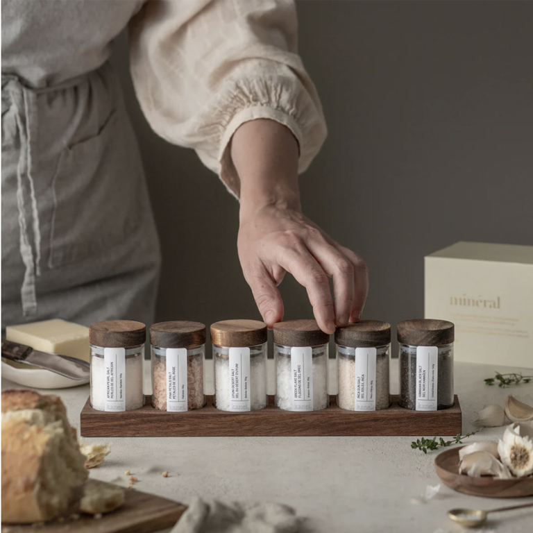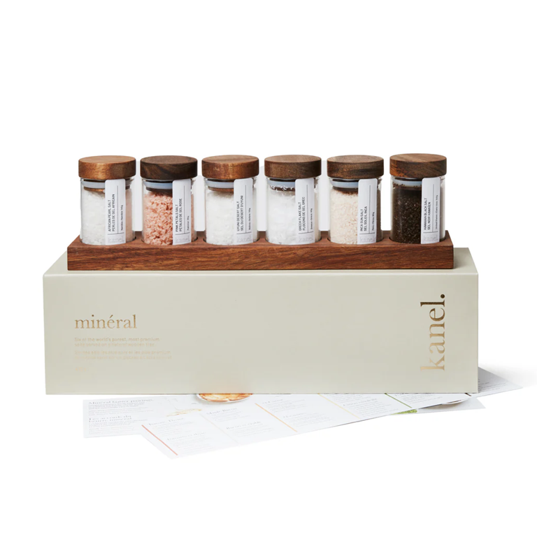 Introducing Minéral, six of the most brilliantly pure salts from around the world. Kanel has scoured the globe to bring you this unique collection, presented in custom glass jars with handmade acacia lids and serving tray.