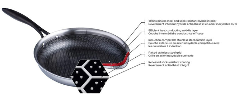 New from the PEI factory that has been making some of the world’s finest cookware since 1979, is the first and only Canadian-made hybridclad frying pan. Combining a raised stainless steel surface with a durable stick-resistant coating to give you the best of both worlds in perfect searing and stick-resistant cooking. Engineered to keep oil in the centre of the pan for better browning and searing, safe for all stovetops and backed by Meyer’s exceptional lifetime warranty, this truly could be the last pan you’ll ever need to buy.