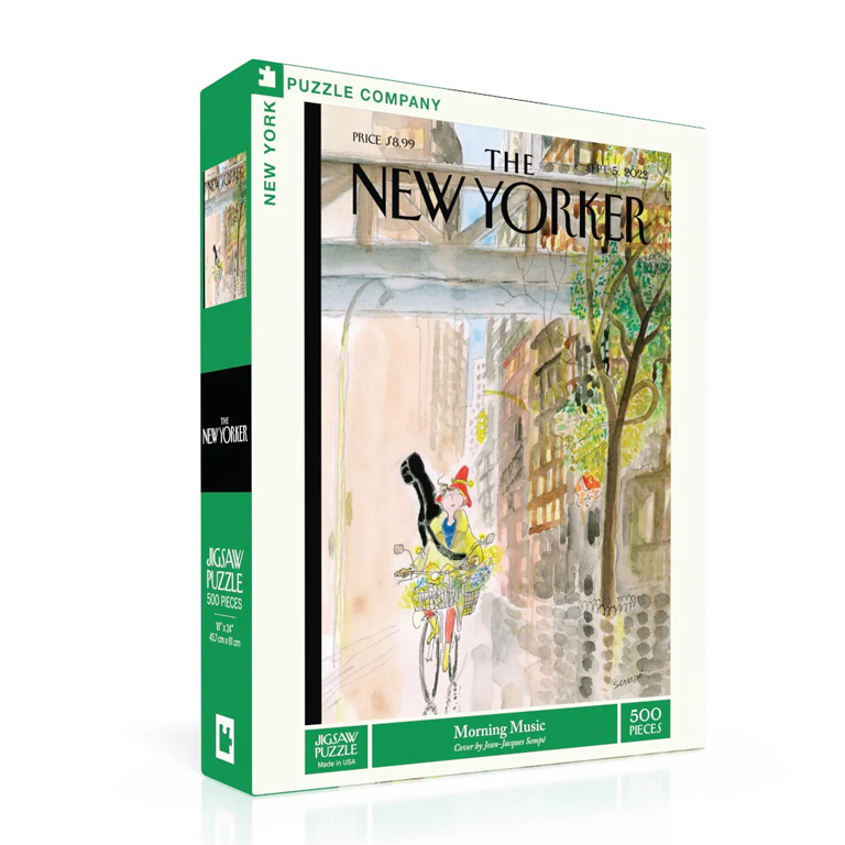 Featuring the New Yorker magazine cover illustrated by Jean-Jacques Sempé and published on September 5, 2022, Morning Music is a thoughtful 500 piece jigsaw puzzle that captures a fleeting, poetic moment in New York City. A musician pedals through the streets with an instrument and groceries in tow, inviting you into a gentle, rhythmic puzzling experience set against the city’s iconic backdrop.