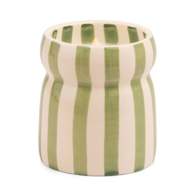 Transport yourself to the world’s most beautiful beaches with the Cabana collection, each designed to evoke the soothing, transformative scents of coastal destinations. These hand painted candles inspired by striped umbrellas are 6.5oz and feature a unique pinched form.