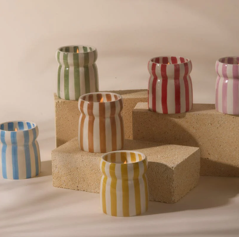 Transport yourself to the world’s most beautiful beaches with the Cabana collection, each designed to evoke the soothing, transformative scents of coastal destinations. These hand painted candles inspired by striped umbrellas are 6.5oz and feature a unique pinched form.