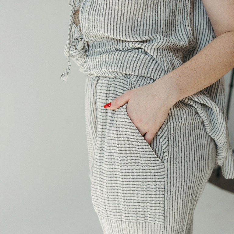 This cotton-linen blend is structured but soft, luxurious and breathable, with low maintenance care without the need for ironing, making it perfect for travel and resort wear. Each piece is dyed using an artisanal dyeing and washing technique, giving each piece a unique lived-in color and an ultra-soft hand feel. Designed in an oversized style, these pants have an elastic waist that fits comfortably around the torso, a loose wide leg, and two inline front pockets.