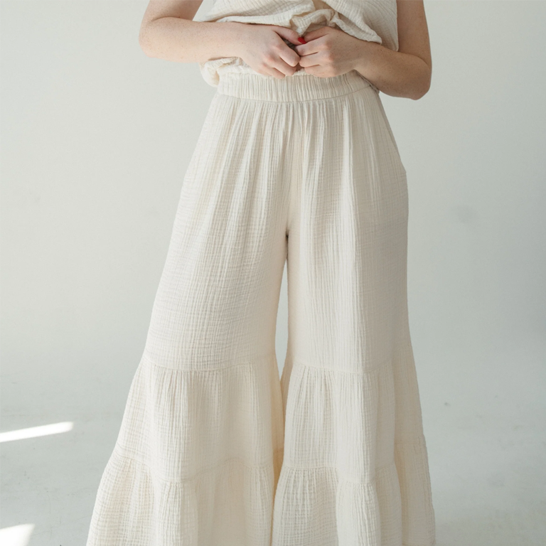Elevate your capsule wardrobe with the graceful Crinkle Ruffle Pants. Featuring a triple-tiered design and flowy silhouette, these pants add a touch of natural, ethereal charm to everyday looks.