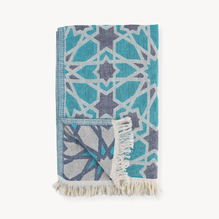 With its generous size and pure Turkish cotton composition, this towel draws you into a world of luxury, wrapping you in comfort after every use. Taking inspiration from the striking, intricate art of Zellij, commonly understood as mosaic tilework, this design has almost a hypnotic effect, in mesmerising shades of blue. The perfect statement towel that looks beautiful hanging in a bathroom, lake-house or even used as a colourful throw for your living room or bedroom.