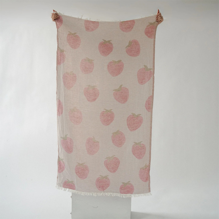 Wrap yourself in a soft moment of summer. This lightweight woven towel features a playful fruit motif in sun-washed pinks and fresh green accents, set against a natural, airy base. The texture is gently crinkled, giving it that lived-in, effortless feel from the very first use.