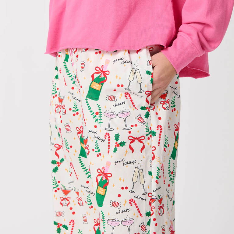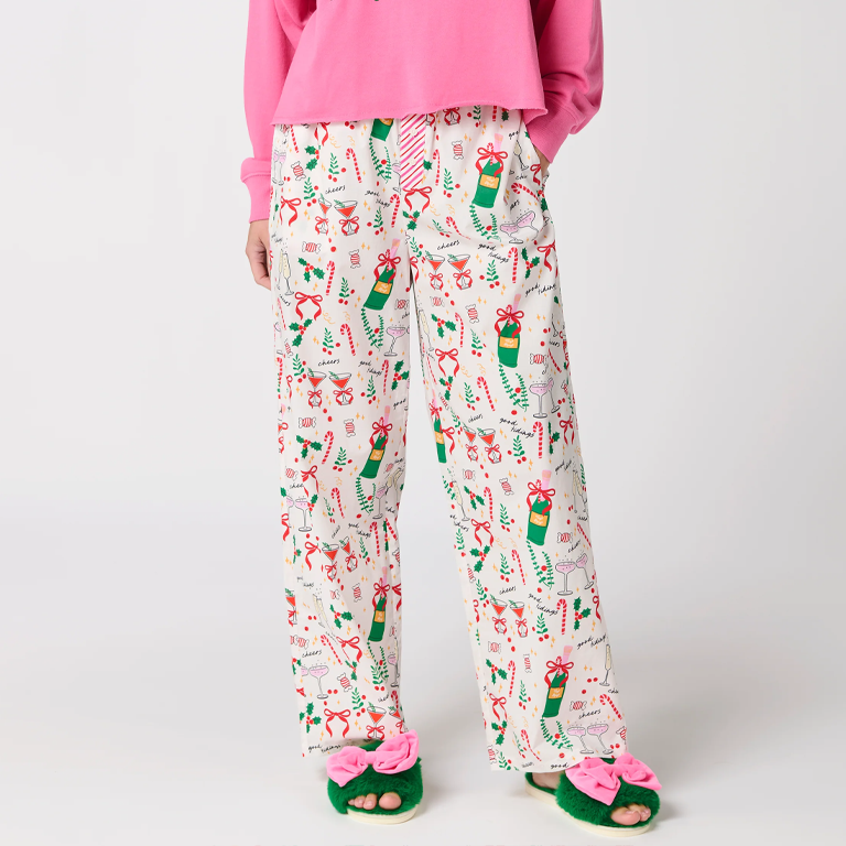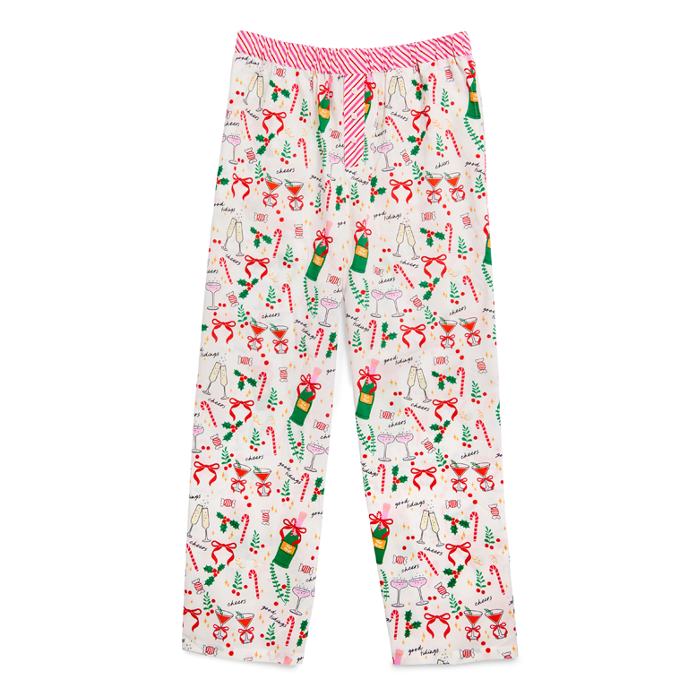 Add some holiday cheer to your loungewear lineup with the Celebration Pajama Pants. These cozy, full-length pajama bottoms feature a festive print of bubbly champagne, candy canes, and mistletoe —all tied together with a pink candy-stripe waistband. With a relaxed fit and 29″ inseam, they’re perfect for sipping cocoa or wrapping presents in comfort.