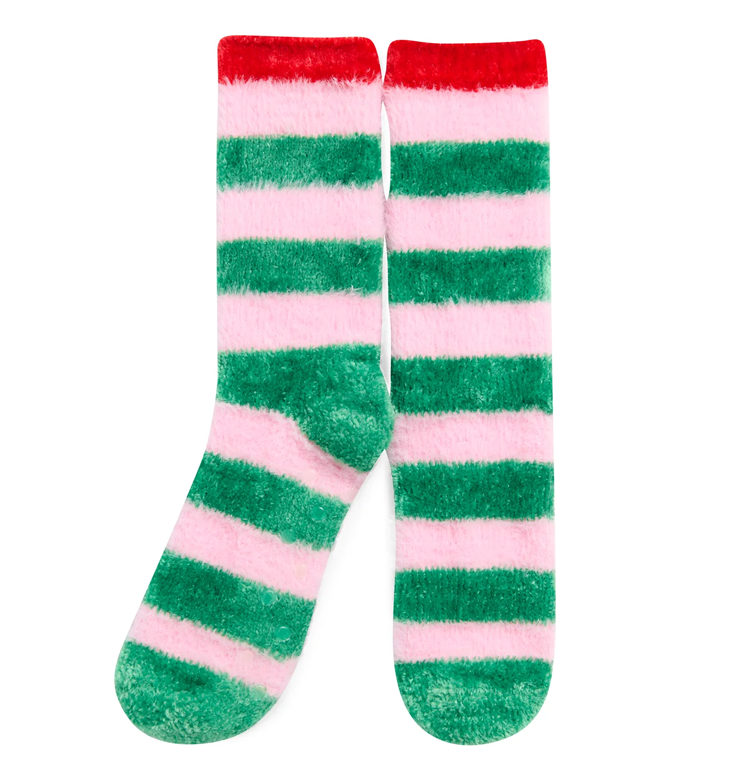 Add a pop of festive fun to your loungewear with the Jolly Socks! Made from soft, fuzzy fabric and finished with rubber grip bottoms, these socks are as functional as they are fabulous. Whether you’re baking cookies, hosting movie night, or just getting cozy, the Jolly Socks are the perfect pick for every joyful moment.