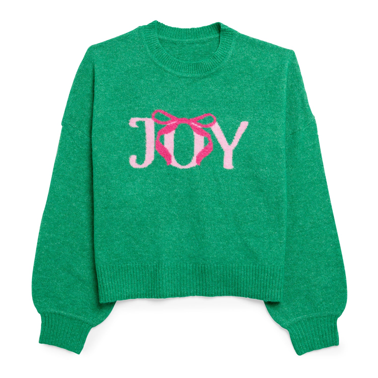 Spread some cheer with the “Joy” Sweater, a festive favorite that’s as merry as it is chic. Featuring the word “Joy” in playful lettering with a pink bow in place of the “O,” this green pullover brings holiday vibes with a fun twist. Made with a soft, cozy knit and a slightly relaxed fit, it’s perfect for sipping champagne or trimming the tree. Whether you’re hosting a holiday party or cozying up fireside, this sweater brings the celebration with you.