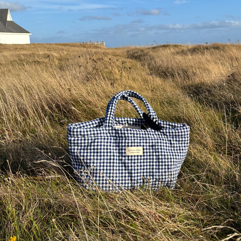 A compact take on the Siena Vida’s classic quilted tote. Handmade in Toronto from sustainably sourced Organic Cotton, this smaller size is perfect for everyday errands, light essentials, or carrying just the right amount on the go. Finished in timeless gingham, it features a roomy interior with an internal pocket to keep your must-haves organized. The fabric for the tote is sourced from Toronto and a tree is planted with every order.